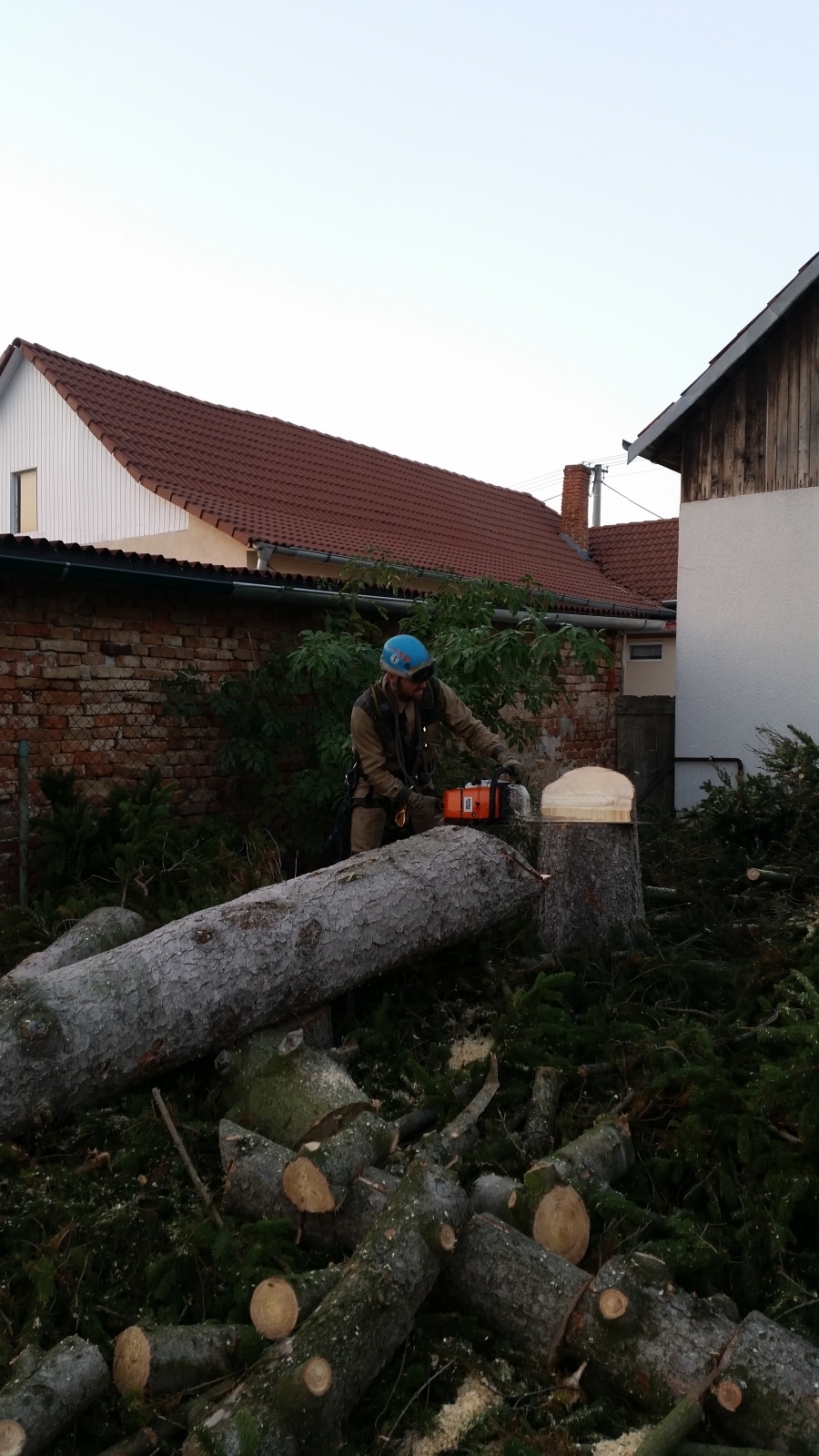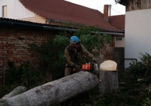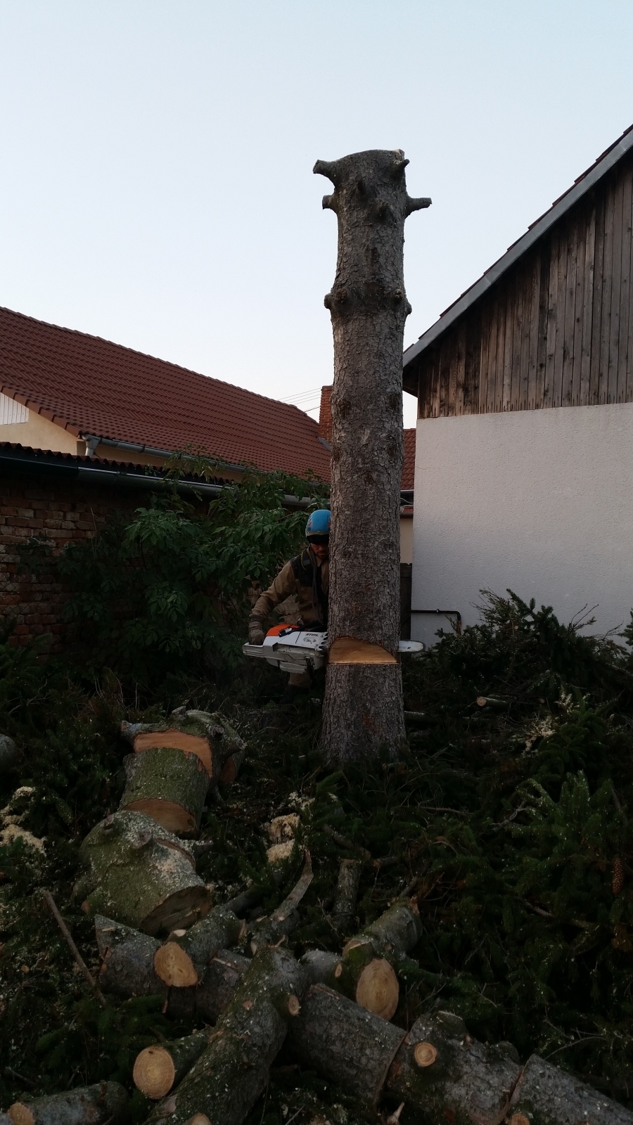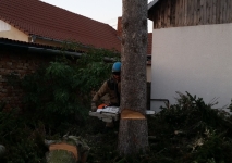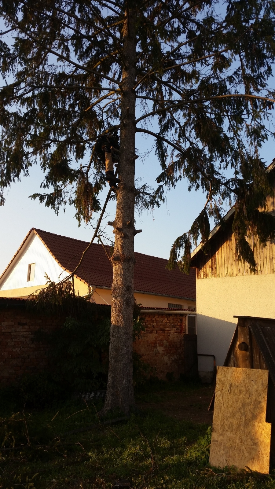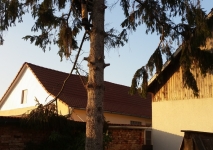 Smrek nad garážou, plotom, vedľa dvoch RD