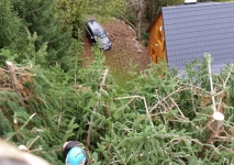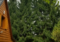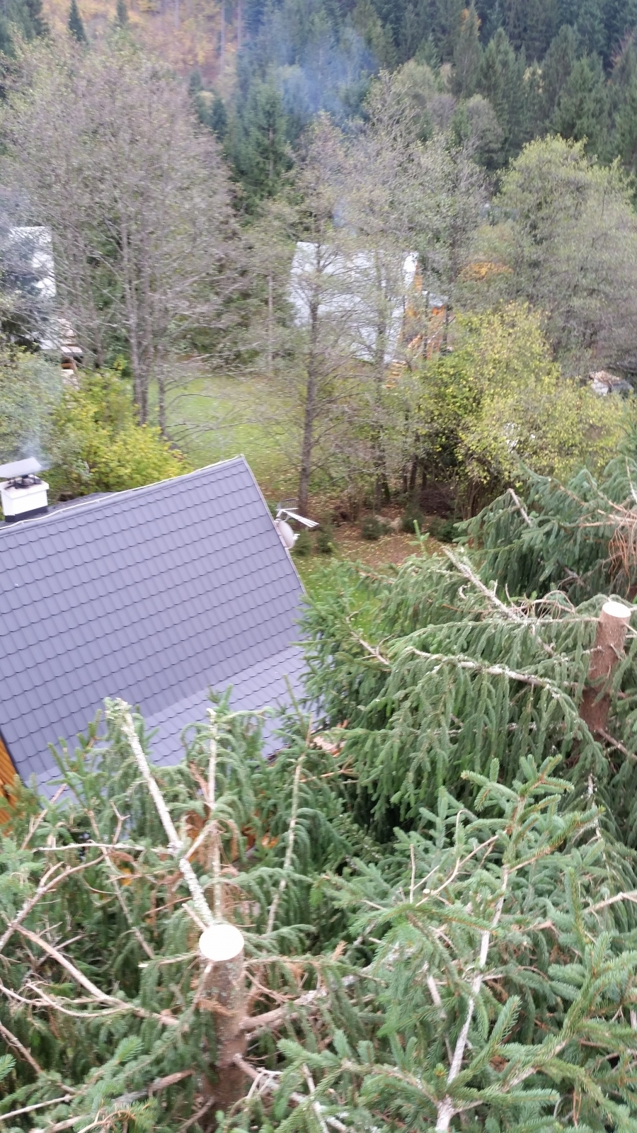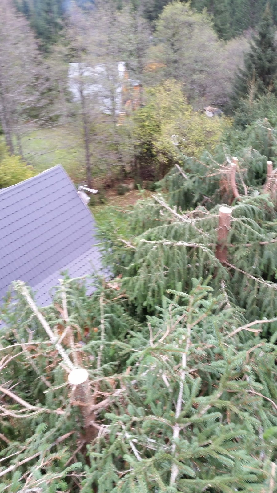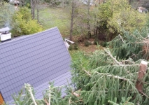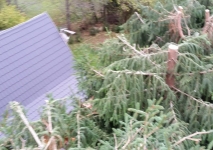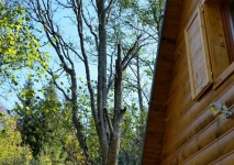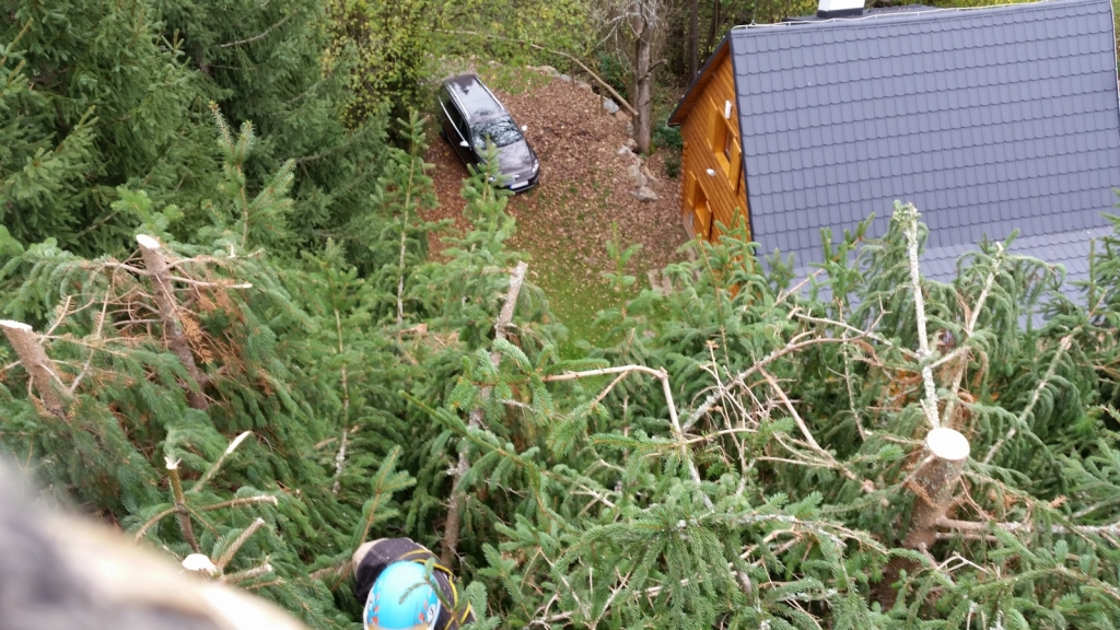 Skrátenie smrekov, odpílenie suchej časti stromu zasahujúcej nad chatu
